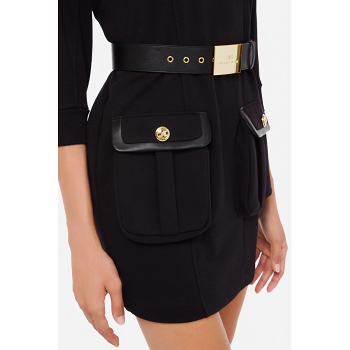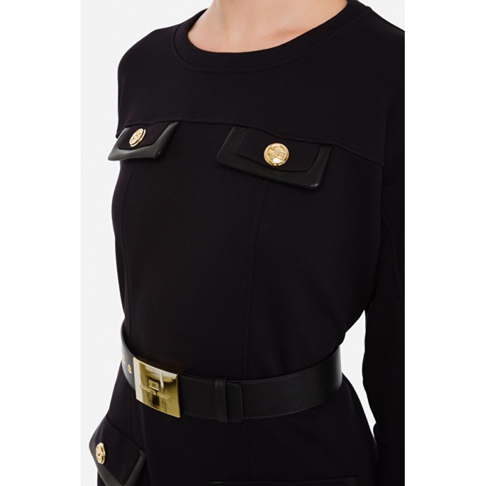 Abito in felpa di cotone a girocollo con ampia spalla scesa e manica a 3⁄4 con patte inserite e bordate da ecopelle sul seno e delle maxi tasche a soffietto sul bacino che riportano la patta con bordatura con cintura logata Elisabetta Franchi