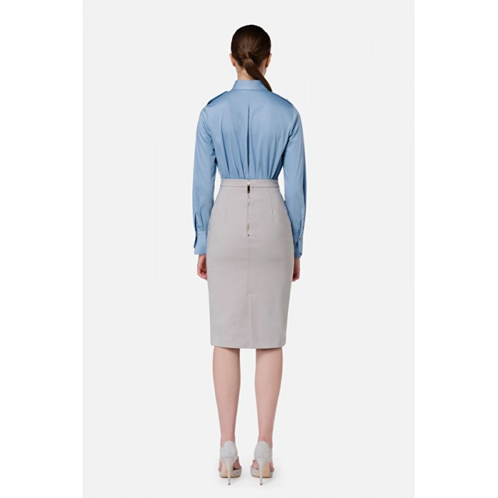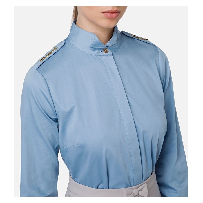 Camicia a manica lunga in raso di cotone stretch dalla linea accostata al corpo con colletto con due mostrine sulle spalle che ospitano morsetti in metallo dorato con logo Eliabetta Franchi