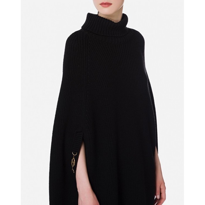 Mantella a collo alto realizzata in maglia a costine con spacco laterale per le mani con logo in oro light Elisabetta Franchi