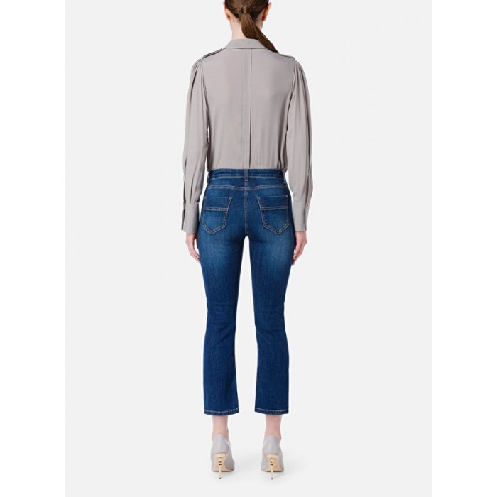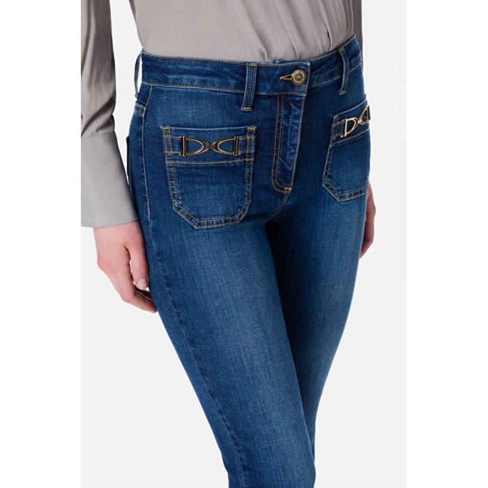 Jeans a zampetta con taschini sagomati davanti dove sono inseriti due morsetti con catene in galvanica oro caratteristici della collezione Elisabetta Franchi.