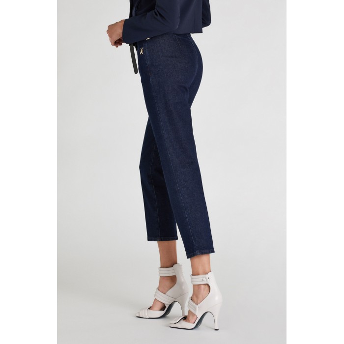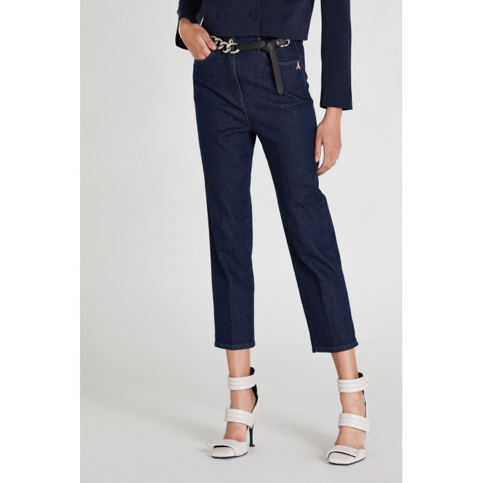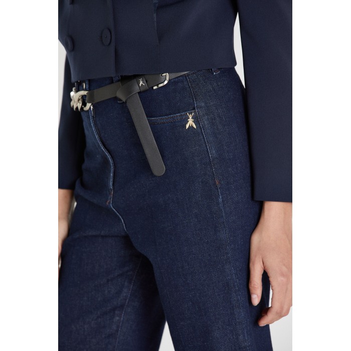 Influssi '70s e un pizzico di glamour per il pantalone in denim indaco stretch con fit aderente e piega stirata sulla gamba con rivetti personalizzati e la Fly Patrizia Pepe sulla tasca aggiungono un tocco luminoso.