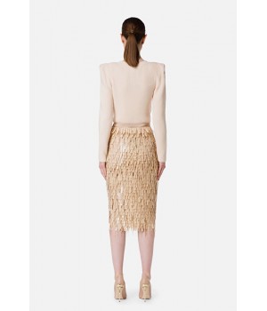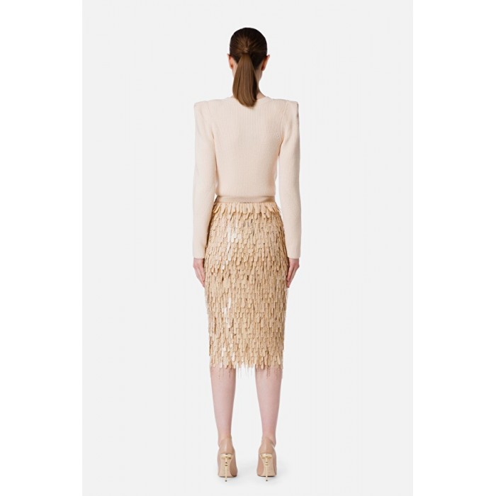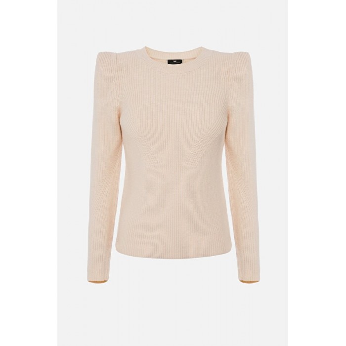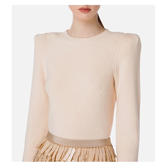 Maglia giro collo in punto pannocchia e gioco di calature nel davanti e nelle maniche della collezione di Elisabetta Franchi caratterizzata da spalline sporgenti che mettono in evidenza le spalle costruite grazie a una piega all’attaccatura delle maniche.