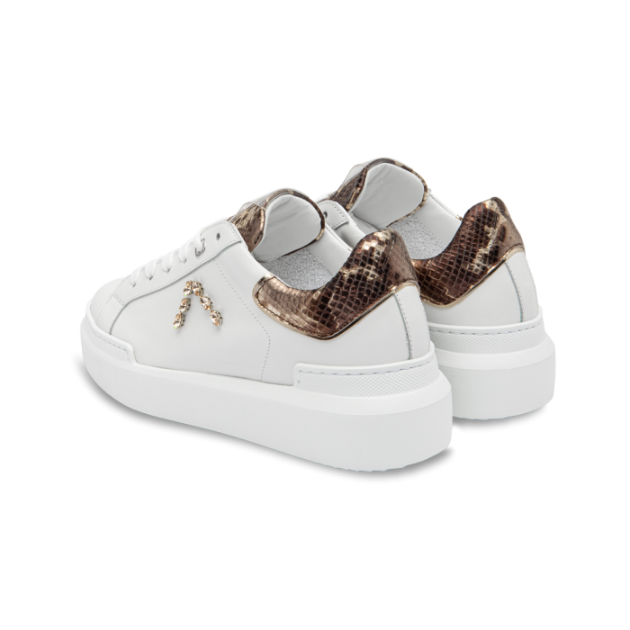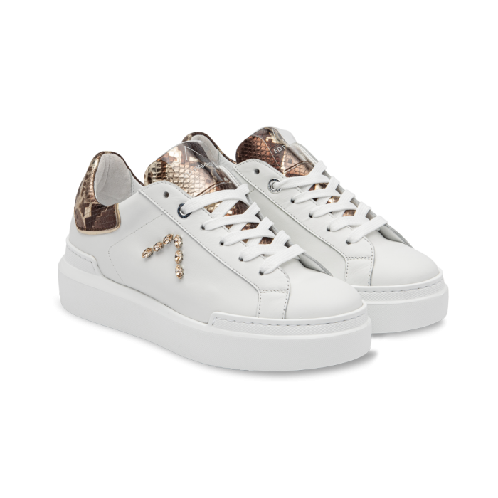 Sneaker Ed Parrish realizzata interamente in pelle bianca con spoiler laccato in fantasia animalier topazio e logo in Swarovski per essere il must-have irrinunciabile per la donna che ama essere fashion.